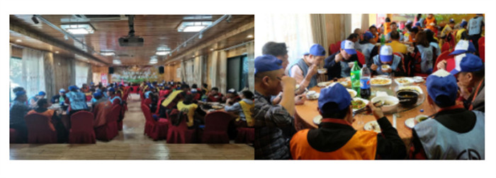几轮项目比拼下来,大家的体力有所下降,也到了饭点,于是大家到餐厅享用了景点的特色农家菜品,补充能量。