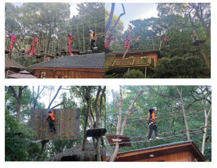 接下来进行了刺激而具有挑战性的冒险黑线项目——飞越丛林。飞越丛林是在树木间搭设各种障碍,将它们连接成一条线路,通过悬空桥梁、秋千、索道等进行闯关探险。在此过程中,需要用爬、滑、跳等方式越过障碍,最终到达终点,这是一个集冒险、运动、娱乐、挑战于一体的项目。在项目进行过程中有些同事吓得直打哆嗦,不敢前进,嘴里直喊:好怕好怕!甚至想打退堂鼓,但在大家的鼓励下,凭着意志,克服重重障碍,最终顺利闯关。通过这个项目让我们知道:敢于挑战自我,做不敢做的事,就是最大的自我突破。只有不断突破自己,挖掘潜力,克服前进道路上的一切困难,结果才会更美好。