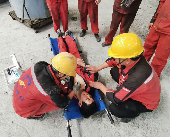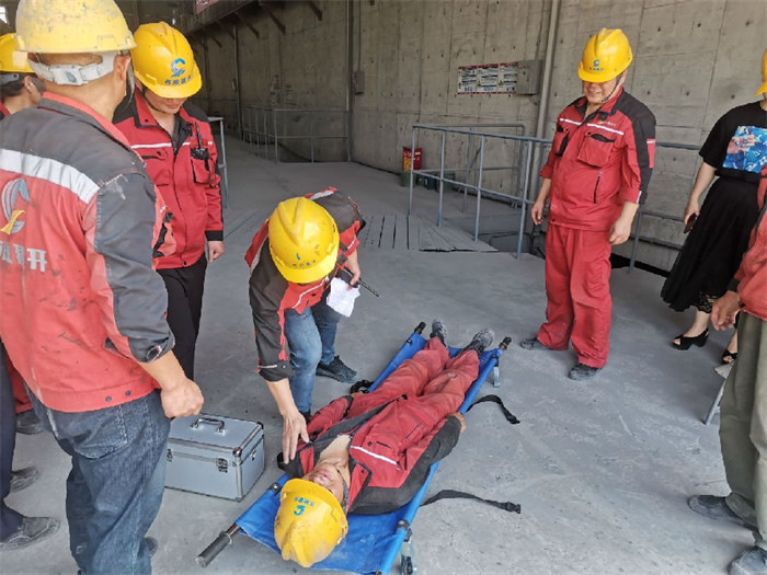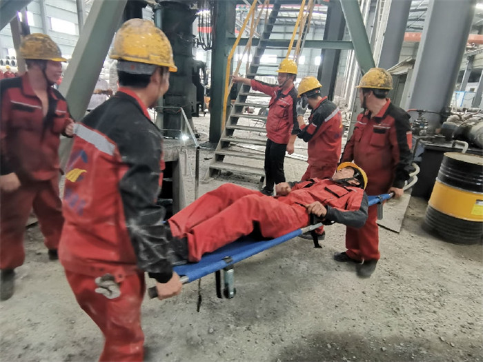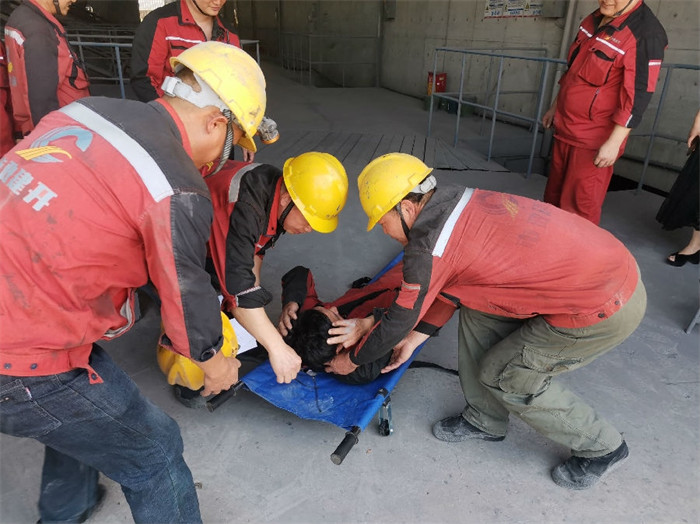 在沥青厂厂长周和宝的指挥下,受限空间内的机械伤害安全应急演练拉开帷幕。拟设料仓地笼有员工发生机械伤害,在对讲机的指挥下,车间员工迅速反应,从发现事故人员到事故报告、抬担架、现场救援,呼叫120等都有条不紊快速有效的进行,按照真实事件的要求和标准完成演练。