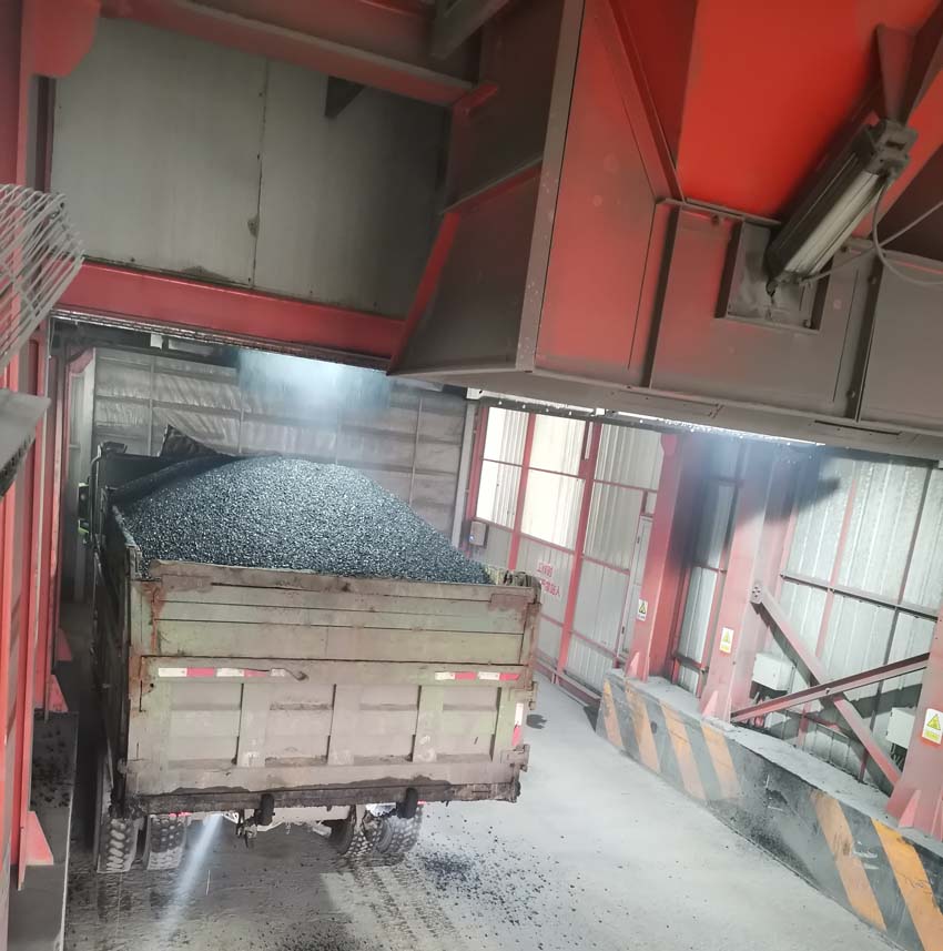 沥青内场,输送皮带载着石料不停运转,旋转的滚筒内火焰正旺,黑的发亮的沥青混凝土源源不断倾卸到车厢。