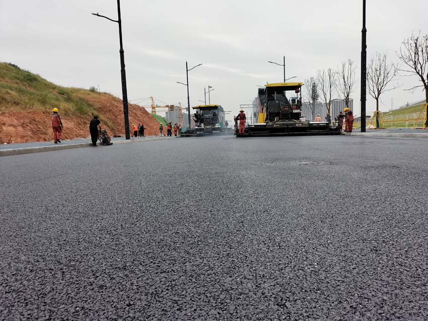 沥青外场,摊铺机轰鸣,压路机来回穿梭,一车车沥青在他们脚下变成平坦的大道。